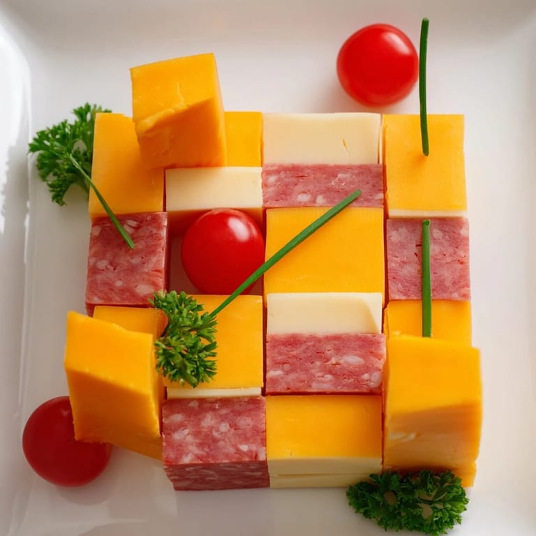 - On your largest platter, arrange the slices in a tight 4x4 grid, alternating cheddar, Swiss, ham, and salami in a true checkerboard pattern. Press them close together so the pattern pops immediately—this is your frame for everything that comes next.