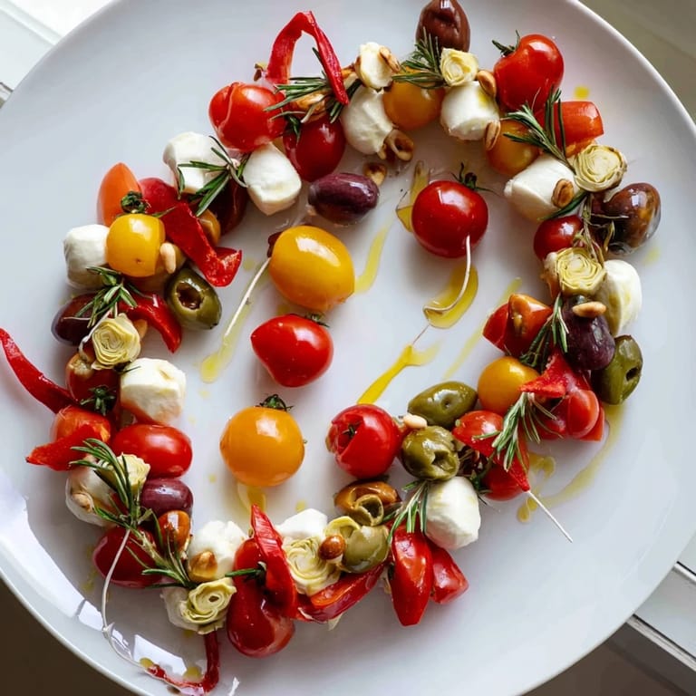 Save A vibrant, Mediterranean-inspired appetizer platter featuring a colorful array of olives, cherry tomatoes, cheeses, and fresh herbs beautifully arranged in a festive garland shape—perfect for last-minute entertaining.