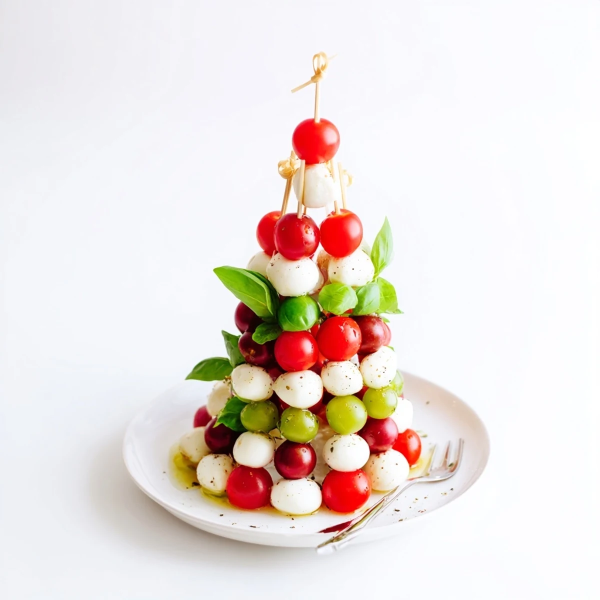 Save A festive and colorful appetizer featuring juicy cherry tomatoes, fresh mozzarella, and basil leaves arranged in a stunning tree shape—perfect for holiday gatherings.