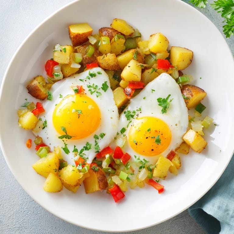 Save A comforting, rustic one-pan meal featuring golden potatoes, sautéed vegetables, and perfectly cooked eggs—ideal for a quick weeknight dinner or hearty breakfast.