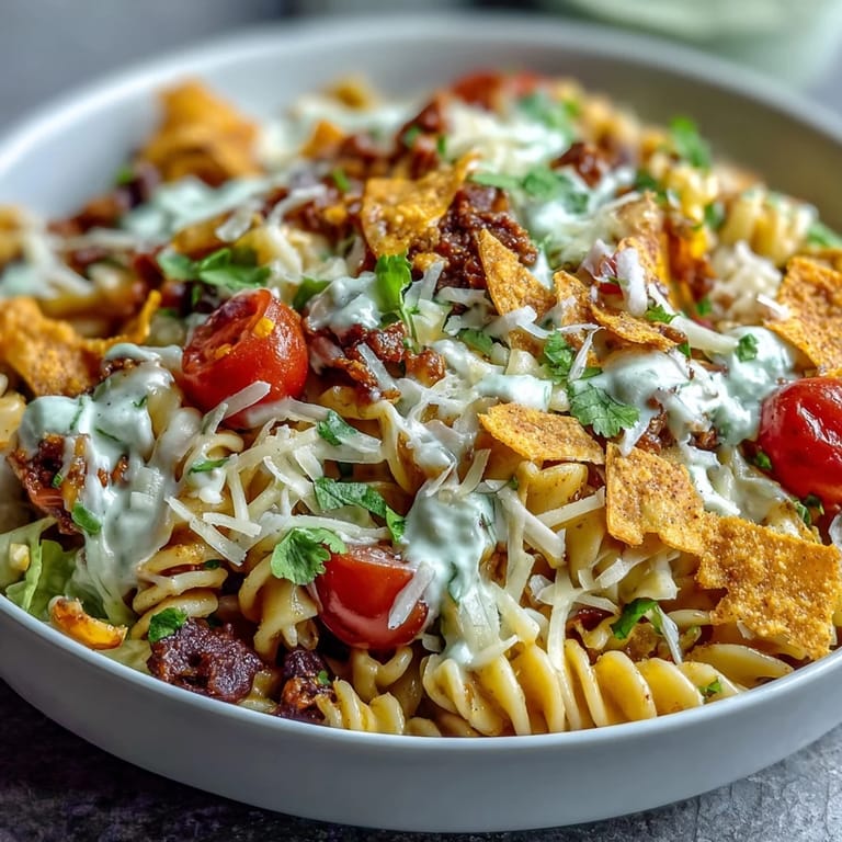 Save My neighbor showed up to a potluck with this taco pasta salad last summer, and I watched people go back for thirds, which honestly never happens at these things. The moment those crushed Doritos hit the creamy avocado ranch, I understood the magic, and by the end of the night I was asking for her recipe while standing in her kitchen with a plate in hand. What makes this salad different from every other pasta situation at a party is that balance of textures, the way the cool pasta holds up to bold flavors, and that salty chip crunch that refuses to apologize. I started making my own version the next week, tweaking things here and there, and now it shows up at every gathering I host.