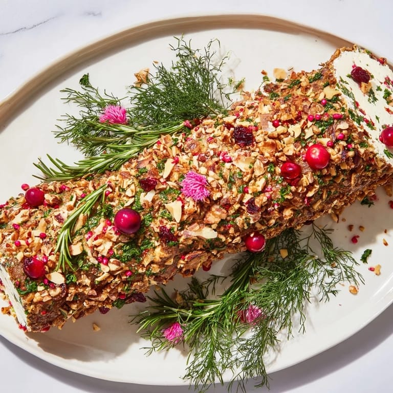 After chilling, the log is rolled in a mixture of chopped walnuts or pecans, fresh parsley, and rosemary, creating a nutty, herbaceous bark-like texture.